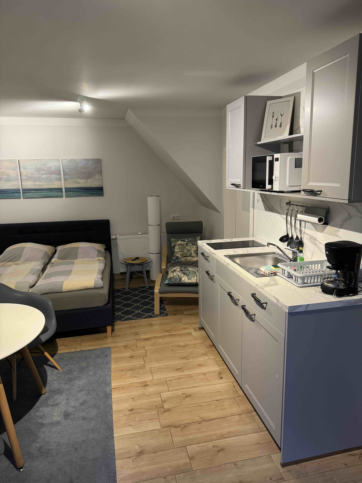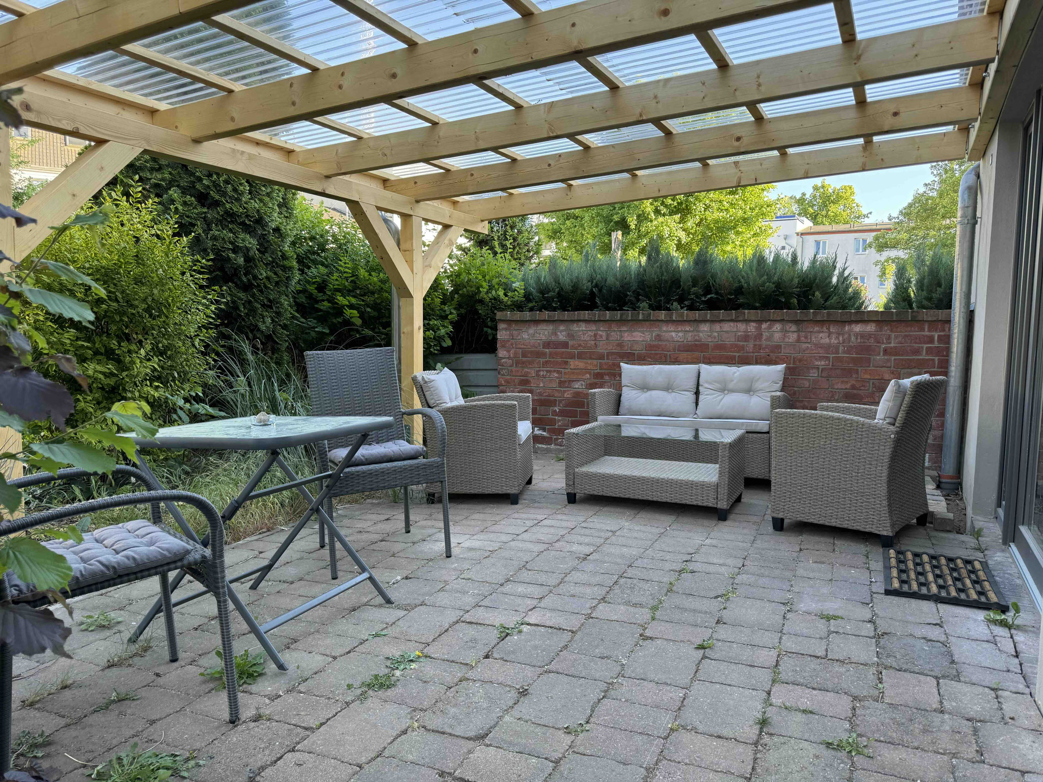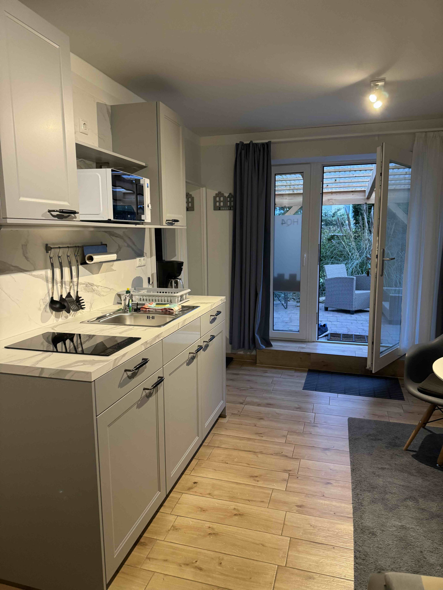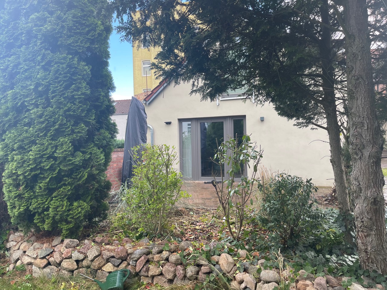 Diese 27 Quadratmeter große ebenerdig gelegene Wohnung befindet sich in unserem modernen Hofquartier, hat jedoch einen separaten Eingang mit privater Terrasse. Vom Ess- und Wohnbereich haben Sie freien Zutritt auf eine schöne große Terrasse mit Sitzgelegenheit, Sonnenschirm und Gartenblick. Die Wohnung bietet Platz für zwei Erwachsene (Doppelbett 160x200). Gern können Sie sich kostenfrei in das W-Lan Netz einloggen. Bitte erfragen Sie bei Ankunft einfach die LogIn Daten.