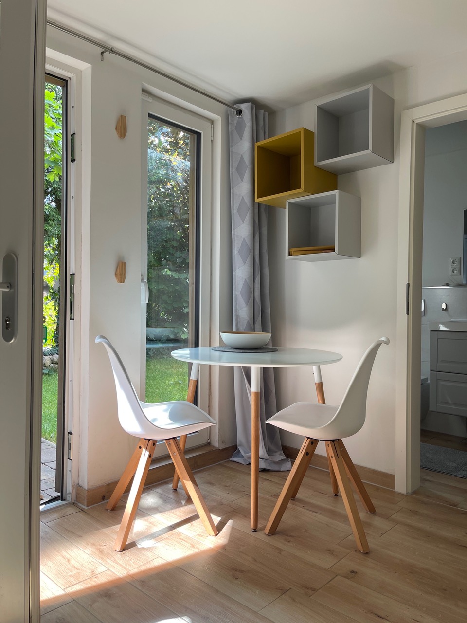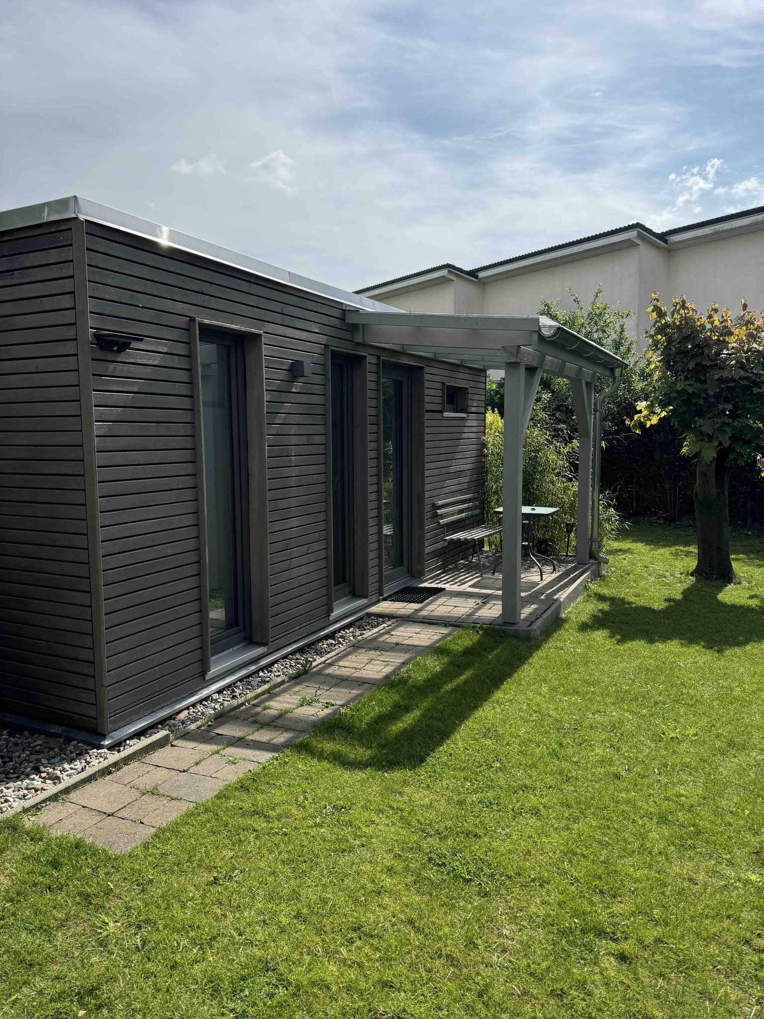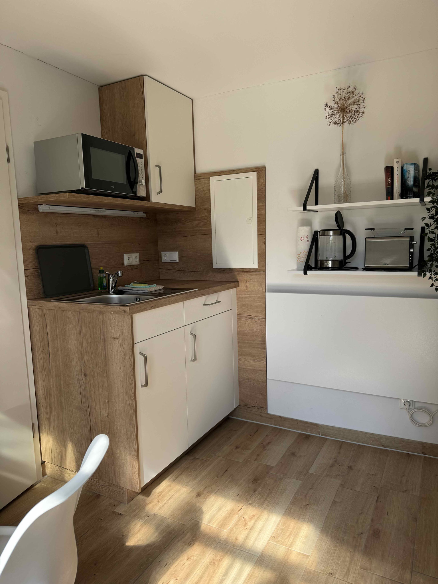 Dieses 22 Quadratmeter große, moderne Tiny House befindet sich ruhig gelegen im hinteren Grundstücksbereich unseres Hofquartiers. Es ist ein wahres Schmuckstück mit privater Terrasse. Hier finden Sie alles auf kleinem und durchdachten Raum. Eben ein Tiny House. Das Tiny House bietet Platz für einen Erwachsenen (Einzelbett 100x200). Wer gerne kuschelt, kann es auf Anfrage auch für zwei Gäste buchen. Gern können Sie sich kostenfrei in das W-Lan Netz einloggen. Bitte erfragen Sie bei Ankunft einfach die LogIn Daten.